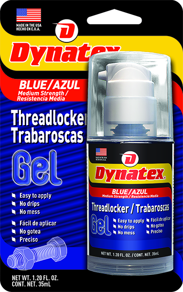 Dynatex® Blue Medium Strength Threadlocker Gel is a medium strength anaerobic thread locking compound. It is designed for locking threaded fasteners that require disassembly with standard hand tools. It is a high viscosity, gel threadlocker specifically designed to not flow or drip off parts during application. The product performs on aluminum, steel, plated parts, stainless steel, and special alloy parts. It exhibits good temperature and is solvent resistant. Locks and seals fasteners and set screws. Use in applications where shock and vibration may cause the fastener to loosen
