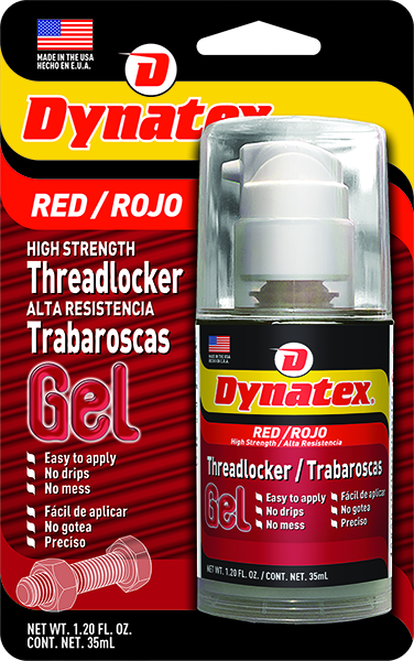 Dynatex® Red Super High Strength Threadlocker Gel is a high strength anaerobic threadlocking material, which cures between engaged threads to form a unitized assembly that resists virtually all leakage, shock and vibration. Packaged in an easy-to-use self-metering pump bottle, which eliminates waste. Easy to apply; no drips, and no mess. Resists virtually all leakage, shock and vibration. Ideal for all 1/4 inch to 1 inch diameter nut and bolt assemblies where future disassembly is improbable. Excellent chemical resistance. Fixture tight in minutes. Protects against thread corrosion.