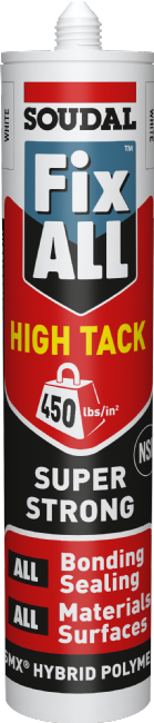 Super strong sealant and adhesive with high initial tack and end strength (450lbs/in²). Based on SMX Polymer Technology, High Tack achieves high performance flexible bonding and sealing of all types of materials onto almost any surface, both porous and non porous, even if wet or humid. Contains XS1 fungicide providing ultimate resistance against mold growth.